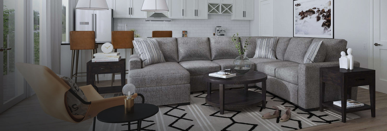Gather around or lounge all day on plush, square seat cushions that will retain their shape over time and can be flipped and rotated for even wear. Black recessed block legs put this piece low to the ground for casual comfort. And style it based on your mood with two-sided accent pillows featuring the neutral chrome body fabric and a coordinating stripe pattern.